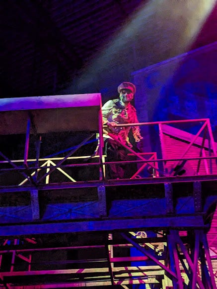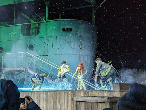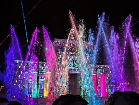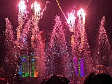 We also caught a couple of stunning performances - one with lasers, lights, water (in addition to the downpour of rain), and fireworks, and the other a live dance act with zombie “survivors” of The Sirius.