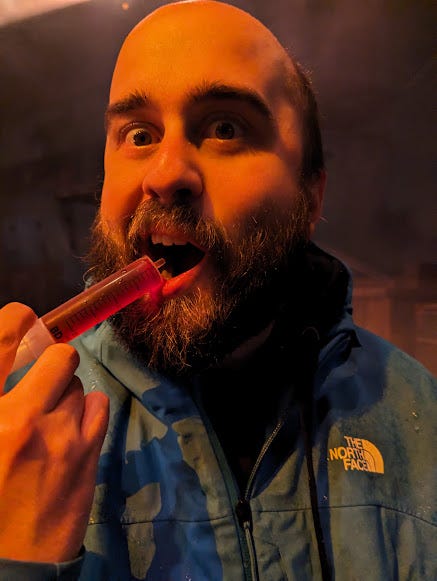 I’m happy to report that karma did finally catch up with Brian at the end of the night. After perhaps one too many rum and sangria syringe shots, he decided to leap across a large puddle in the parking lot and absolutely wiped out in the mud. Honestly I’m still laughing about it nearly as hard a week later! (He’s fine.)